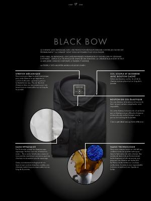 DITES ADIEU AU REPASSAGE , AUX CAFÉS RENVERSÉS INTEMPESTIFS ET TACHES LORS DE DÉJEUNER D ’ AFFAIRES . GRÂCE À LA TECHNOLOGIE AVANCÉE DES NANOTEX , LA CHEMISE BLACK BOW SE VEUT LA MEILLEURE CHEMISE CORPORATE A TRAVERS LE MONDE .