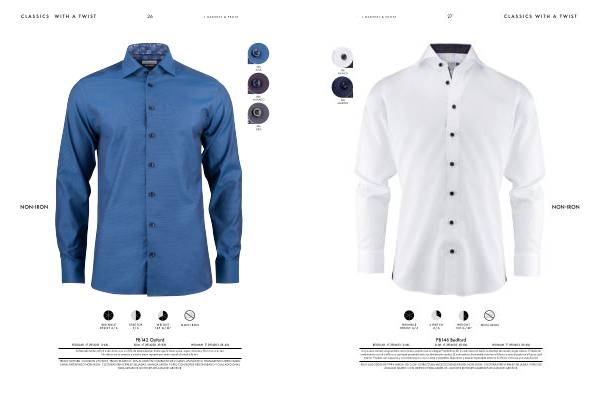 TEJIDO OXFORD . COLOR EN 2 TONOS . TEJIDO ELÁSTICO . 96 % ALGODÓN COMPACTO DE 2 CAPAS , 4 % ELÁSTICO . TRATAMIENTO MEDIOAMBI- ENTAL PATENTADO NON-IRON . COSTURAS PRINCIPALES SELLADAS . MANGA LARGA . PUÑO CON BORDE REDONDEADO Y OJAL ADICIONAL PARA GEMELOS . BOTONES DE 4 MM DE GROSOR .