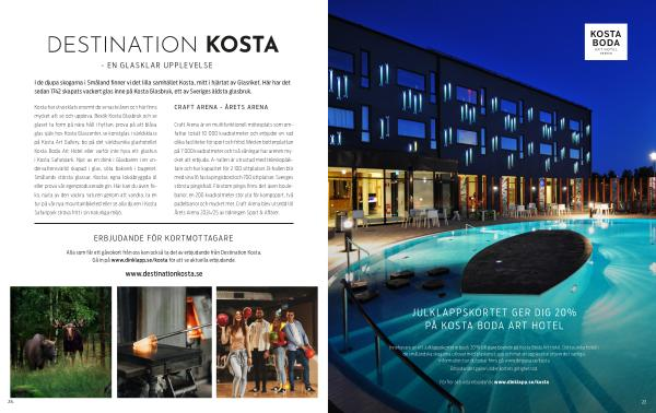 Innehavare av ett Julklappskortet erbjuds 20 % billigare boende på Kosta Boda Art Hotel. Detta unika hotell i de småländska skogarna utlovar med glaskonst, spa och mat en upplevelse utöver det vanliga. Information hur du bokar finns på www. dingava. se / kosta Erbjudandet gäller under kortets giltighetstid.