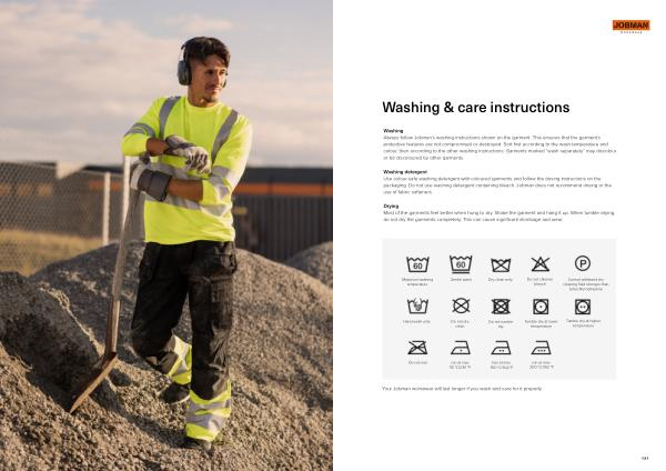 Washing Always follow Jobman’ s washing instructions shown on the garment. This ensures that the garment’ s protective features are not compromised or destroyed. Sort first according to the wash temperature and colour, then according to the other washing instructions. Garments marked” wash separately” may discolour or be discoloured by other garments.