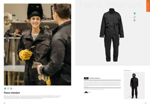100 % flame-retardant treated cotton. CE-certified, tested, and approved according to EN ISO 11611 and EN ISO 11612. The certification signifies that the material and garment design provide protection against edge ignition and flame propagation; it does not melt. It also withstands heat according to the test standards, which helps prevent burn injuries.