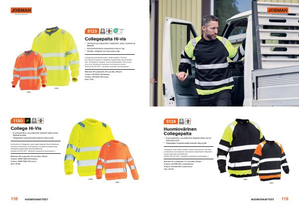 Huomiovärinen collegepaita , jossa harjattu sisäpinta . Resorit pääntiessä , helmassa ja hihansuissa . Kuumapainetut , saumattomat heijastinraidat . Olkapäiden heijastinraidat näkyvät ylhäältä päin . Sertifioitu EN ISO 20471 -standardin mukaisesti huomioluokkaan 3 .