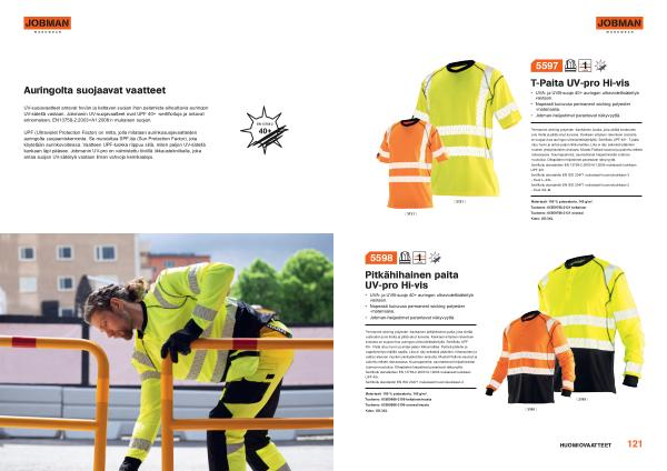 UV-suojavaatteet antavat hyvän ja kattavan suojan ihon palamista aiheuttavia auringon UV-säteitä vastaan . Jobmanin UV-suojavaatteet ovat UPF 40 + -sertifioituja ja antavat erinomaisen , EN13758-2:2003 + A1:2006 : n mukaisen suojan .