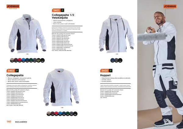 Materiaali : 80 % puuvillaa , 20 % polyesteriä , 320 g / m ². Tuotenro : 65540020-1099 valkoinen / musta Tuotenro : 65540020-6799 mariini / musta Tuotenro : 65540020-9899 tummanharmaa / musta Tuotenro : 65540020-9999 musta Koko : XXS-4XL