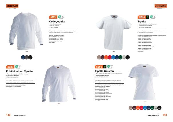Materiaali : 100 % puuvillaa ( harmaa 85 % puuvillaa , 15 % viskoosi ), 180 g / m ². Tuotenro : 65526510-1000 valkoinen Tuotenro : 65526510-1400 khaki Tuotenro : 65526510-1700 ruskea Tuotenro : 65526510-3000 oranssi Tuotenro : 65526510-4100 punainen Tuotenro : 65526510-6500 tummansininen Tuotenro : 65526510-6700 mariini Tuotenro : 65526510-7500 metsänvihreä Tuotenro : 65526510-9300 harmaa Tuotenro : 65526510-9900 musta Koko : XS-3XL