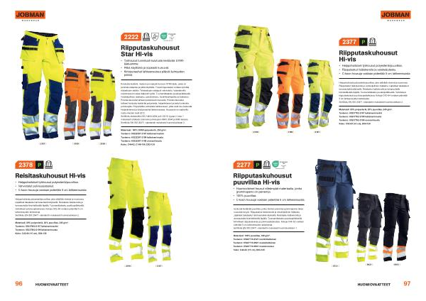 Helppohoitoista polyesteriä / puuvillaa , joka säilyttää värinsä ja muotonsa . Riipputaskut lisälokerolla ja vetoketjullinen lisätasku . Läpälliset takataskut tarranauhakiinnityksellä . Reisitasku lisälokerolla ja tarranauhalla kiinnitettävällä läpällä . Tuumamittatasku puukkopidikkeellä . Vahvikkeet riipputaskuissa ja polvisuojataskuissa . Kokoja C42 – 64 voidaan pidentää 5 cm lahkeensuiden taitoksesta . Sertifioitu EN ISO 20471 -standardin mukaisesti huomioluokkaan 2 .