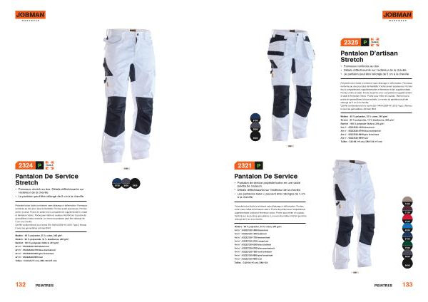 Matière : 65 % polyester , 35 % coton , 245 g / m ². Stretch : 90 % polyamide , 10 % élasthanne , 240 g / m ². Renfort : 100 % polyester Oxford , 210 g / m ². Art n ° : 65232420-1099 blanc / noir Art n ° : 65232420-6799 bleu marine / noir Art n ° : 65232420-9899 gris foncé / noir Art n ° : 65232420-9999 noir Tailles : C42-64 (+ 5 cm ), D84-124 (+ 5 cm )