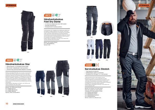 Lettstelt polyester / bomull som holder på fargen og formen . Stretchpaneler på baksiden , for økt bevegelsesfrihet . Romslige frontlommer . Baklommer med klaff . Benlomme med ekstra rom og klaff med borrelås . Tommestokklomme med knivholder . Forsterkning på knebeskyttelseslommer og med to høyder for knebeskytterne . Buksebenet kan forlenges 5 cm ved at kanten på bena brettes ned . Sertifisert ifølge EN 14404:2004 + A1:2010 type 2 , nivå 0 sammen med Jobmans knebeskytter 9941 .