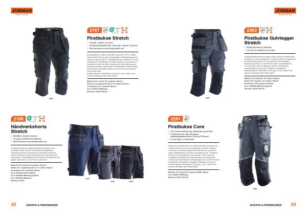 Lettstelt polyester / bomull som holder på fargen og formen . Stretchpaneler på baksiden , for økt bevegelsesfrihet . Romslige frontlommer . Hengelommer med forsterkning og ekstra rom , og en ekstra lomme med glidelås . Benlomme med ekstra rom og klaff med borrelås . Tommestokklomme med knivholder . Lomme for teppekniver på låret . Forsterkning på knebeskyttelseslommer og med to høyder for knebeskytterne . Sertifisert ifølge EN 14404:2004 + A1:2010 type 2 , nivå 1 sammen med Jobmans knebeskytter 9943 , 9944 og 9945 .