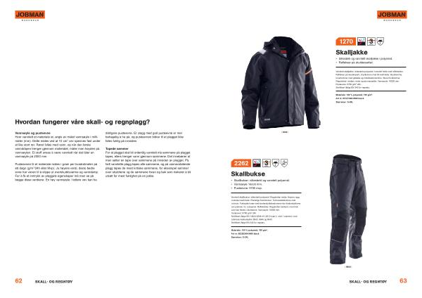 Vanntett skallbukse i slitesterkt polyamid . Regulerbar midje . Høyere rygg motvirker kald trekk . Romslige frontlommer . Tommestokklomme med knivrom . Forbøyde knær med knebeskyttelseslommer der knebeskytterne kan justeres i to posisjoner . Refleksbise . Regulerbar benkant , med krok som kan festes i skolissene . Vannsøyle : 16000 mm . Pusteevne : 9700 g / m ² 24h . Sertifisert ifølge EN 14404:2004 + A1:2010 type 2 , nivå 1 sammen med Jobmans knebeskytter 9943 , 9944 og 9945 . Sertifisert ifølge EN 343 for regntøy .