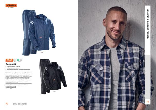 Trikotmaterialet er rive- og slitesterkt og har lang levetid . Stretchfunksjonen gir stor bevegelsesfrihet . Sydde og sveisede sømmer . Det myke materialet beholder bevegeligheten også når det er kaldt . Sertifisert ifølge EUstandarden EN343 , noe som innebærer at det er godkjent ifølge EUs regler for regntøy . Avtagbar hette med trykknapper . Ermekant med borrelås . Frontlommer med klaff . Justerbar snor i linningen nede . Refleks på skuldrene og i nakken . Buksen har strikk i midjen og lommeåpninger foran med klaff , noe som gjør det lett å komme til lommer på innsiden . Sertifisert ifølge EN 343 for regntøy .