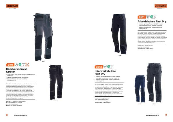 Smidig 4-veis stretch i slitesterkt ripstop-materiale . Romslige hengelommer med ekstra rom og forsterket innside ; kan puttes i frontlommene . Silikonbånd i bukselinningen holder buksen på plass . Forsterket stretch Cordura ® i skrittet . Delvis fritthengende baklommer gjør at det lettere å få tak i innholdet . Ekstra beltehemper på de største størrelsene . Hammerhank . Tommestokklomme med knivholder . Benlomme med skjult glidelås , ID-kortholder og mobiltelefonlomme . Forbøyde knær med knebeskyttelseslommer i stretch Cordura ® med 3Ms refleksbiser og to høyder . Mesh i knefolden for ventilasjon . Forsterket benkant i polyamid som ikke absorberer fukt . Refleksbise og innstramming nede på benet . Sertifisert ifølge EN 14404:2004 + A1:2010 type 2 , nivå 1 sammen med Jobmans knebeskytter 9943 , 9944 og 9945 .