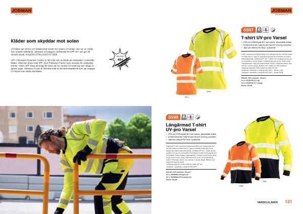 T-shirt i permanent wicking polyester som transporterar bort fukt från huden och håller dig torr . Tyget är speciellt konstruerat för att skydda mot solens ultravioletta strålar , certifierat UPF 40 +. T-shirten har bra passform som ger bra rörelsefrihet . Svarta detaljer i halsringningen gör smuts mindre synlig . Flatlocksömmar i svart och printad etikett i nacken . Påvärmda reflexer utan sömmar i Jobman design . Reflexer över axlarna för ökad synbarhet . Certifierad enligt EN 13758-2:2003 + A1:2006 UPF 40 +. Certifierad i varselklass 3 enligt EN ISO 20471 - Storlek L-3XL . Certifierad i varselklass 2 enligt EN ISO 20471 - Storlek XS-M .