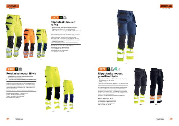 Kulutusta kestävää puuvillaa , jonka hieman pienempi grammapaino tekee housuista kevyet . Riipputaskut lisälokerolla ja vetoketjullinen lisätasku . Läpälliset takataskut tarranauhakiinnityksellä . Reisitasku lisälokerolla ja tarranauhalla kiinnitettävällä läpällä . Tuumamittatasku puukkopidikkeellä . Vahvikkeet riipputaskuissa ja polvisuojataskuissa . Kokoja C44 – 62 voidaan pidentää 5 cm lahkeensuiden taitoksesta . Sertifioitu EN ISO 20471 -standardin mukaisesti huomioluokkaan 1 .