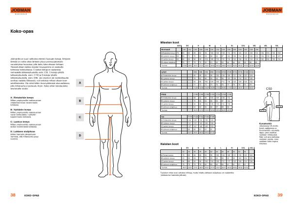 Jobmanilla on suuri valikoima etenkin housujen kokoja . Erityisen tärkeää on valita oikea lahkeen pituus polvisuojataskulla varustetuissa housuissa , jotta tasku tulee oikeaan kohtaan . Yleisesti ottaen kaikkia miesten housujamme on saatavilla kolmessa kokoluokassa . C-luokan kokoja on saatavissa normaaleilla lahkeenpituuksilla , esim . C50 , C-kokoja pitkillä lahkeenpituuksilla , esim . C150 ja D-kokoja lyhyillä lahkeenpituuksilla , esim . D96 . Jos sinulla ei ole mahdollisuutta sovittaa vaatetta liikkeessä , voit tarkistaa mittasi oikean koon selvittämiseksi . Ota mitat tällöin ihonmyötäisissä alusvaatteissa , jotta mittanauha ei painaudu ihoon . Katso sitten kokotaulukko seuraavalla sivulla .