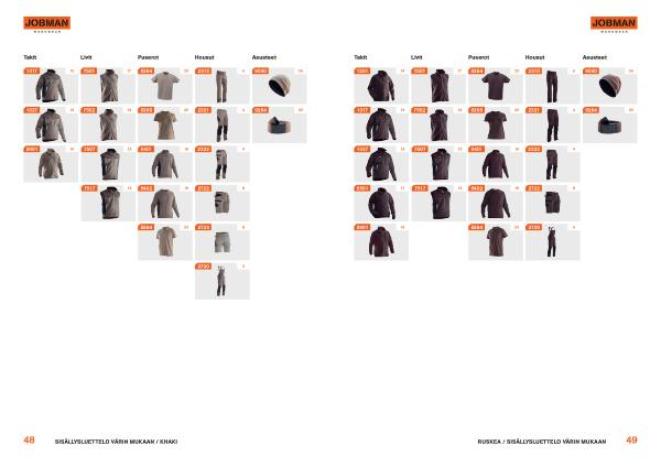 48 17 14 12 13 20 20 19 19 23 6 4 4 8 8 5 36 36 13 12 16 5901 1327 1317 7501 7502 7507 7517 5264 5265 5402 5564 5401 2313 2322 2321 2722 2723 3730 9040 9284 Asusteet SISÄLLYSLUETTELO VÄRIN MUKAAN / KHAKI Housut Puserot Livit Takit