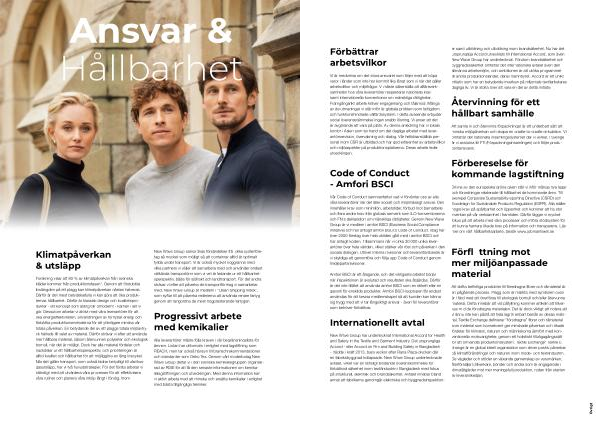 Forskning visar att 80 % av klimatpåverkan från svenska kläder kommer från produktionsfasen *. Genom att fördubbla livslängden på ett plagg kan klimatpåverkan nästan halveras. Därför är det mest betydelsefulla vi kan göra att öka produkternas hållbarhet. Därför är klassisk design och kvalitetsprodukter- ett koncept som aldrig blir omodernt- kärnan i allt vi gör. Dessutom arbetar vi aktivt med våra leverantörer för att öka energieffektiviteten, användningen av förnybar energi och förbättra produktionsmetoderna för att ytterligare minska vår totala påverkan. En betydande del av ett plaggs totala miljöavtryck härleds till valet av material. Därför strävar vi efter att använda mer hållbara material, såsom återvunnen polyester och ekologisk bomull, när det är möjligt. Dock har alla material fördelar och nackdelar ur ett hållbarhetsperspektiv, och prioriteringen är alltid kvalitet och hållbarhet för att möjliggöra en lång livscykel. När det gäller transport, som också bidrar betydligt till växthusgasutsläpp, har vi två huvudstrategier. För det första arbetar vi ständigt med att utvärdera våra processer för att effektivisera våra rutiner och planera våra inköp långt i förväg. Inom