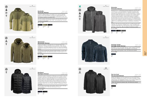 Ytterjacka: 100 % återvunnen polyester 255 g / m ², C. 0 DWR. Innerjacka: Skal: 100 % återvunnen polyamide, C. 0 DWR, 38 g / m ². Foder: 100 % återvunnen polyester, C. 0 WR, 37g / m ². Vadd: 95 % återvunnen polyester 5 % polyester, 160 g / m ² kropp / 100 g / m ² ärm, Oeko-Tex Standard 100, återvunna material