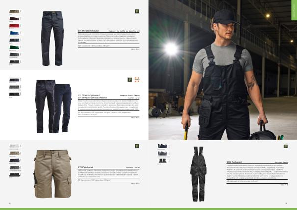 Helppohoitoiset avohaalarit , jotka on valmistettu kestävästä polyesteri / puuvillasekoitteesta . Materiaali säilyttää värinsä ja muotonsa pesuista huolimatta . Rintataskut , joista oikeanpuoleisessa läppä ja tarranauhakiinnitys . Henkselit resorilla . Riipputaskut lisälokerolla ja vetoketjullinen lisätasku . Läpälliset takataskut tarranauhakiinnityksellä . Reisitasku lisälokerolla ja tarranauhalla kiinnitettävällä läpällä . Tuumamittatasku puukkopidikkeellä . Vahvikkeet polvisuojataskuissa . Kokoja C42 – 64 voidaan pidentää 5 cm lahkeensuiden taitoksesta .