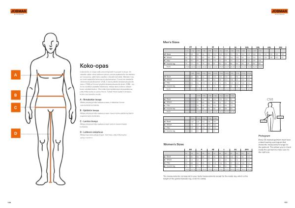 Jobmanilla on laaja valikoima erityisesti housujen kokoja. On tärkeää valita oikea lahkeen pituus polvisuojataskulla varustetuissa housuissa, jotta tasku asettuu oikealle kohdalle. Miesten housut ovat saatavilla kolmessa kokoluokassa: C-koot normaaleilla lahkeenpituuksilla( esim. C50), C-koot pitkillä lahkeenpituuksilla( esim. C150) ja D-koot lyhyillä lahkeenpituuksilla( esim. D96). Jos et voi sovittaa vaatetta liikkeessä, mittaa itsesi kotona oikean koon selvittämiseksi. Ota mitta ihonmyötäisissä alusvaatteissa, jotta mittanauha ei painu ihoon. Tarkat mitat löydät kokotaulukosta seuraavalta sivulta.