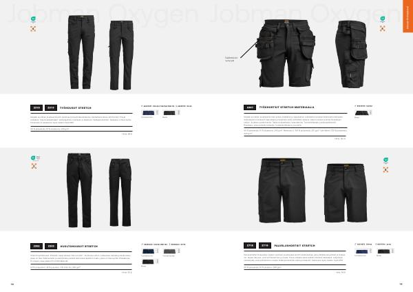 Stretch-huoltohousut. Piilotettu nappi edessä” Non-scratch”-muotoilua varten. Lahkeessa oikealla puolella tasku, jossa on tilaa mittanauhalle ja vasemmalla puolella lahkeessa läpällinen tasku, jossa on tilaa kynille. Etutaskussa D-rengas, jossa paikka ID-korttipidikkeelle. |