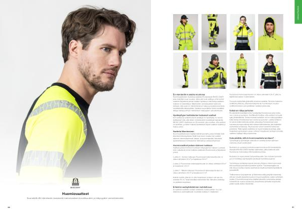 Hyväksyttyjen testilaitosten testaamat vaatteet Kun vaatteet ja asiaankuuluvat asiakirjat on hyväksytty, ne saavat todistuksen siitä, että niiden ominaisuudet noudattavat standardia EN ISO 20471. Vaatteissa on CE-merkintä, joka osoittaa, että vaatteet on sertifioitu, ja niiden mukana toimitetaan ohjeet vaatteen käyttöä ja hoitoa varten.