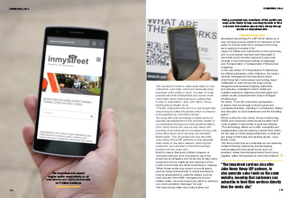 “ We are about to enter a nationwide rollout of new‘ interactive’ work sites, which will eventually allow members of the public to‘ scan’ our sites on major projects with their smartphones and access more information about what is going on outside their homes or businesses,” says John Henry Group HSEQ director Martin Cook.“ The QR code points the user to a new Google-like search engine called Inmystreet, which is powered and supported by John Henry Group.”“ By using QR code technology in street works on specially developed permit and courtesy boards or on residential noticing and communications letters, John Henry Group can now not only assist with providing more information to members of the public about what works we’ re carrying out near them. Martin adds:“ The Inmystreet services also offer John Henry Group ISP partners, to also generate sales leads on the same website, meaning that customers can subscribe to their fibre services directly from the works site.” Martin’ s view is that every utilities company or contractor with any form of powers to dig in the street has an obligatory and moral duty to take every measure to inform residents and members of the public of works that are either impending or ongoing.“ When these works may impact on social space, such as living environments or where businesses may be jeopardised by potential delays, such as road closures from traffic management around utilities works, we must make every effort to enhance our communications message,” he said“ We have simply taken this a step further and developed something of a USP which allows us a new and easy-access platform for members of the public to find out what we’ re doing and how long we’ re going to be doing it for.” Impact of utilities and road works on the community and on commuters has been well discussed in the media and it remains topical and was most recently in the Chartered Institute of Highways and Transportation’ s Transportation Professional magazine. In the July edition of Transportation Professional, the official publication of the institution, the body’ s network management and operations panel chair Steve Kent wrote about overcoming major challenges to overcoming‘ the long running’ disagreements between highway authorities and statutory undertakers which install and maintain extensive networks of buried pipes and cables usually buried beneath busy and fragile infrastructure. He wrote:“ From the road users’ perspective is seems that not enough is done to plan and coordinate activities, resulting in unnecessary delays and disruption to local businesses and the travelling public.” Which is why the John Henry Group’ s technology, HSEQ and corporate communications team have come together to deliver the Inmystreet initiative.“ This technology allows us to offer a powerful and supplimentary communications channel from which we are able to inform people effectively of what we are doing in their living and working space”, says Martin Cook.“ We like to think that as a business we are relatively forward-thinking, embracing and developing technologies and Inmystreet is one such an example, where internal departments have come together within the business to drive this initiative.”