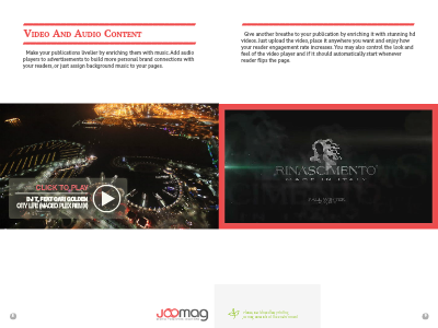 Give another breathe to your publication by enriching it with stunning hd videos. Just upload the video, place it anywhere you want and enjoy how your reader engagement rate increases. You may also control the look and feel of the video player and if it should automatically start whenever reader flips the page.
