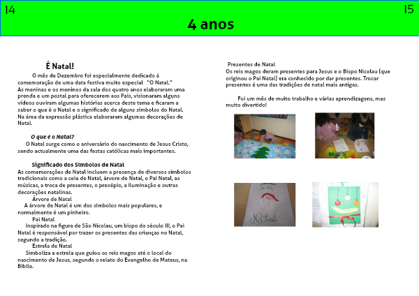 As meninas e os meninos da sala dos quatro anos elaboraram uma prenda e um postal para oferecerem aos Pais, visionaram alguns vídeos ouviram algumas histórias acerca deste tema e ficaram a saber o que é o Natal e o significado de alguns símbolos do Natal.