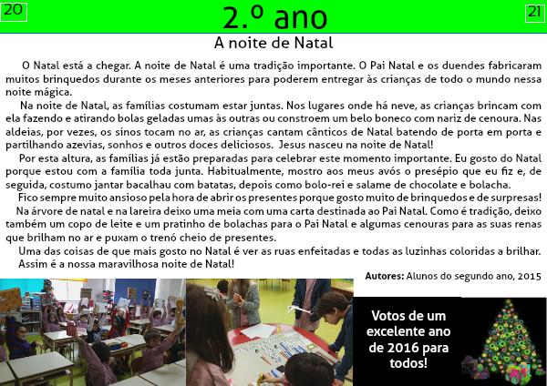 Por esta altura, as famílias já estão preparadas para celebrar este momento importante. Eu gosto do Natal porque estou com a família toda junta. Habitualmente, mostro aos meus avós o presépio que eu fiz e, de seguida, costumo jantar bacalhau com batatas, depois como bolo-rei e salame de chocolate e bolacha.