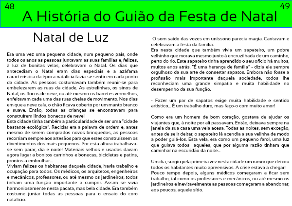 Viviam felizes os habitantes daquela cidade, havia trabalho e ocupação para todos. Os médicos, os arquitetos, engenheiros e mecânicos, professores, ou até mesmo os jardineiros, todos tinham uma função importante a cumprir. Assim se vivia harmoniosamente nesta pacata, mas bela cidade. Era também costume juntar todas as pessoas para o ensaio do coro natalício.