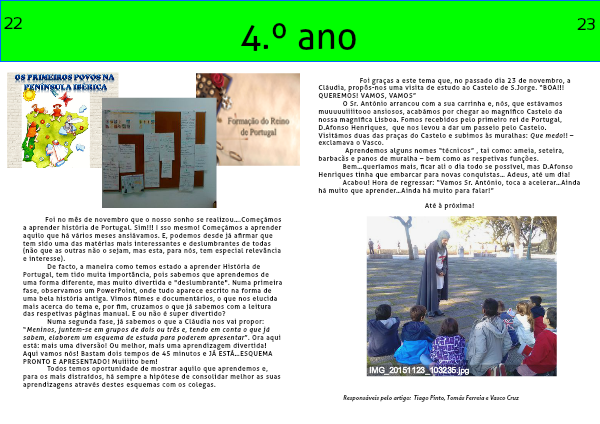 De facto, a maneira como temos estado a aprender História de Portugal, tem tido muita importância, pois sabemos que aprendemos de uma forma diferente, mas muito divertida e "deslumbrante". Numa primeira fase, observamos um PowerPoint, onde tudo aparece escrito na forma de uma bela história antiga. Vimos filmes e documentários, o que nos elucida mais acerca do tema e, por fim, cruzamos o que já sabemos com a leitura das respetivas páginas manual. É ou não é super divertido?