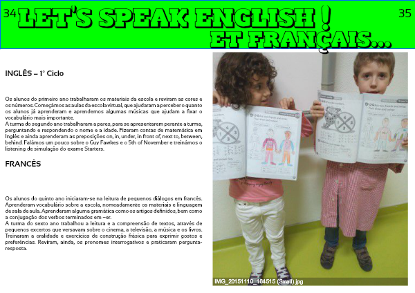 Os alunos do primeiro ano trabalharam os materiais da escola e reviram as cores e os números. Começámos as aulas da escola virtual, que ajudaram a perceber o quanto os alunos já aprenderam e aprendemos algumas músicas que ajudam a fixar o vocabulário mais importante.