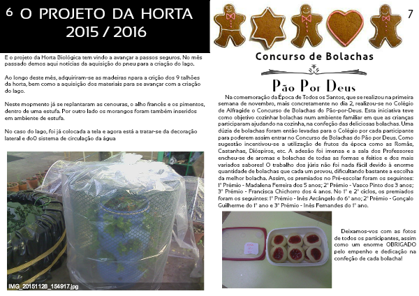 Na comemoração da Época de Todos os Santos, que se realizou na primeira semana de novembro, mais concretamente no dia 2, realizou-se no Colégio de Alfragide o Concurso de Bolachas do Pão-por-Deus. Esta iniciativa teve como objetivo cozinhar bolachas num ambiente familiar em que as crianças participaram ajudando na cozinha, na confeção das deliciosas bolachas. Uma dúzia de bolachas foram então levadas para o Colégio por cada participante para poderem assim entrar no Concurso de Bolachas do Pão por Deus. Como sugestão incentivou-se a utilização de frutos da época como as Romãs, Castanhas, Dióspiros, etc. A adesão foi imensa e a sala dos Professores encheu-se de aromas e bolachas de todas as formas e feitios e dos mais variados sabores! O trabalho dos júris não foi nada fácil devido à enorme quantidade de bolachas que cada um provou, dificultando bastante a escolha da melhor bolacha. Assim, os premiados no Pré-escolar foram os seguintes: 1º Prémio - Madalena Ferreira dos 5 anos; 2º Prémio - Vasco Pinto dos 3 anos; 3º Prémio - Francisca Chichorro dos 4 anos. No 1º e 2º ciclos, os premiados foram os seguintes: 1º Prémio - Inês Arcângelo do 6º ano; 2º Prémio - Gonçalo Guilherme do 1º ano e 3º Prémio - Inês Fernandes do 1º ano.