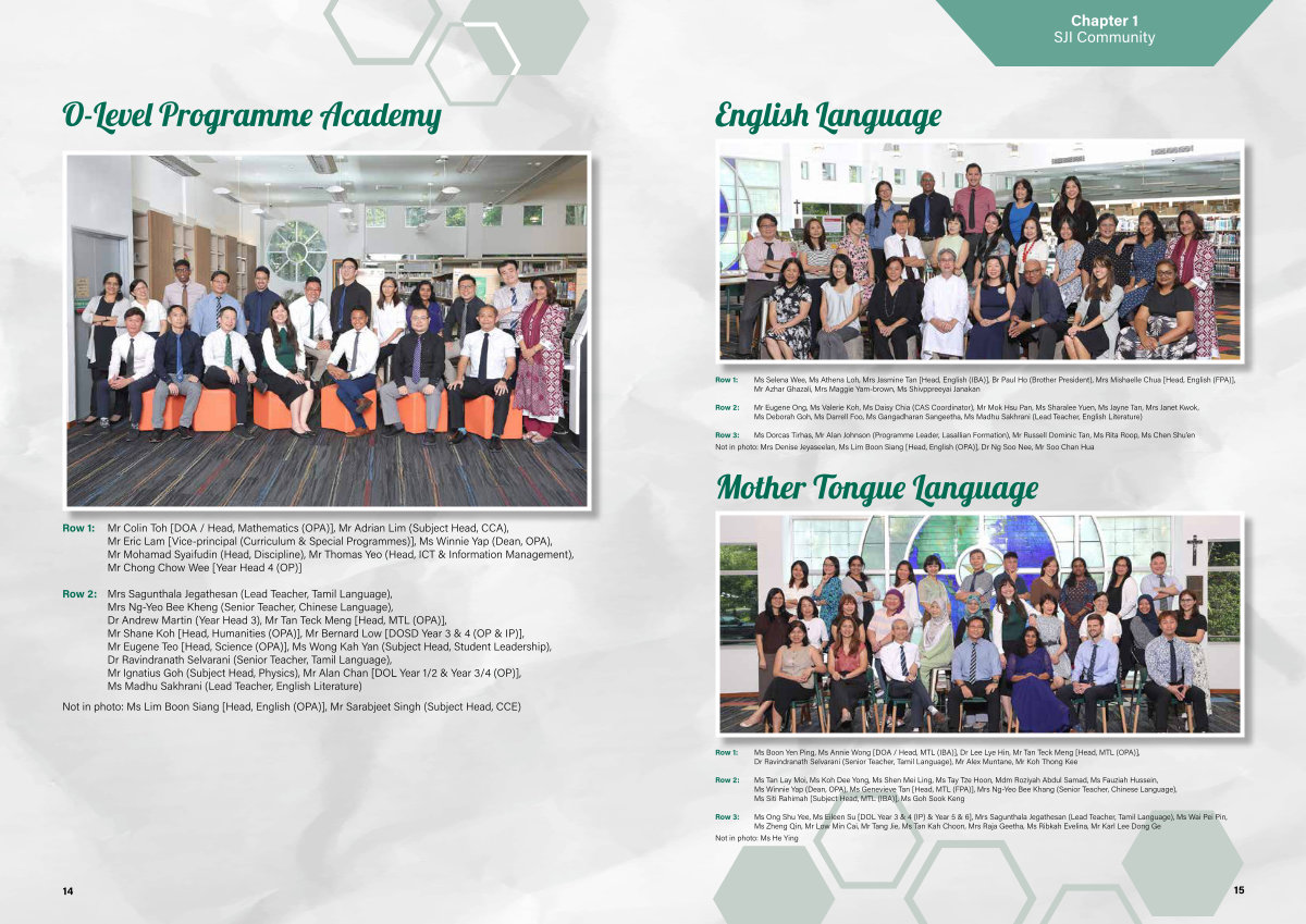 Row 3: Ms Dorcas Tirhas, Mr Alan Johnson( Programme Leader, Lasallian Formation), Mr Russell Dominic Tan, Ms Rita Roop, Ms Chen Shu’ en Not in photo: Mrs Denise Jeyaseelan, Ms Lim Boon Siang [ Head, English( OPA)], Dr Ng Soo Nee, Mr Soo Chan Hua