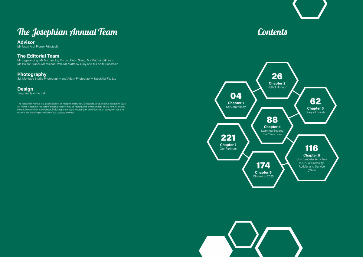 The Josephian Annual is a publication of St Joseph’ s Institution, Singapore. @ St Joseph’ s Institution 2025. All Rights Reserved. No part of this publication may be reproduced or transmitted in any form or by any means, electronic or mechanical, including photocopy, recording or any information storage or retrieval system, without the permission of the copyright owner.