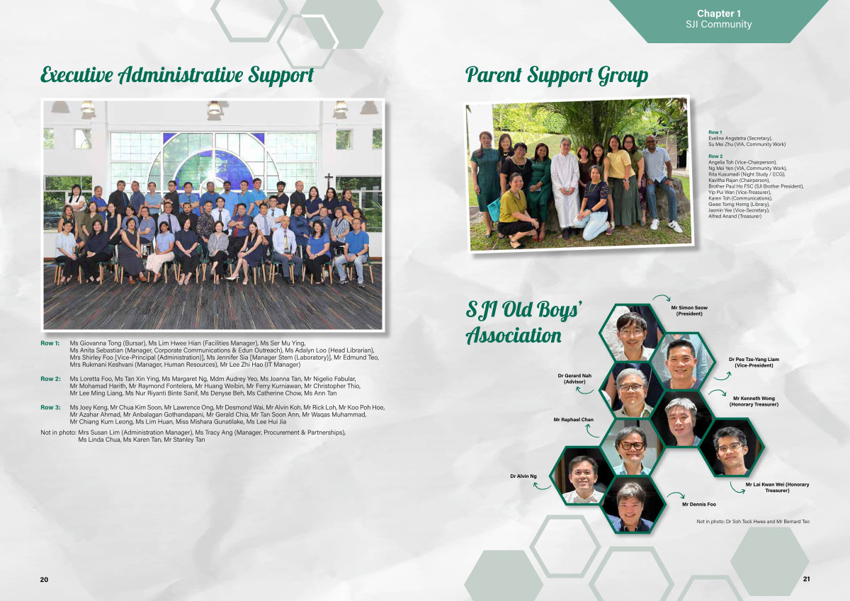 Row 2 Angelia Toh( Vice-Chairperson), Ng Mei Yen( VIA, Community Work), Rita Kusumadi( Night Study / ECG), Kavitha Rajan( Chairperson), Brother Paul Ho FSC( SJI Brother President), Yip Pui Wan( Vice-Treasurer), Karen Toh( Communications), Gwee Torng Horng( Library), Jasmin Yee( Vice-Secretary), Alfred Anand( Treasurer)