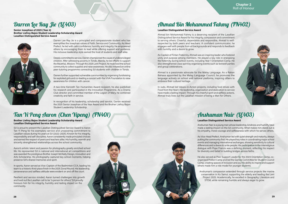Ahmad bin Mohammed Fahmy is a deserving recipient of the Lasallian Distinguished Service Award for his integrity, compassion and commitment to serving others. Cheerful, dependable and responsible, Ahmad is wellrespected by both peers and teachers. A confident communicator, he engages well with people from all backgrounds and responds to feedback with humility and a desire to grow.