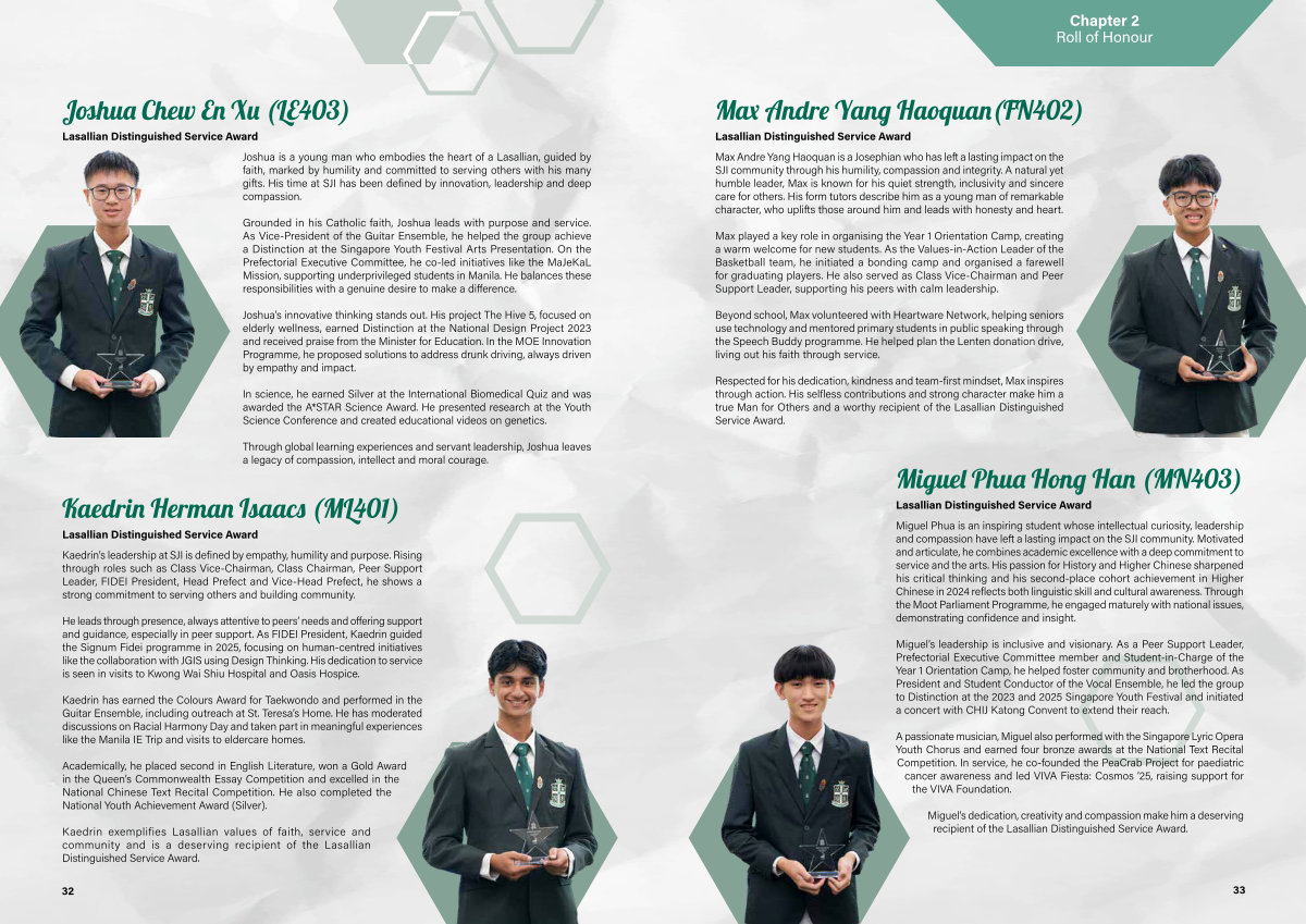 Miguel’ s leadership is inclusive and visionary. As a Peer Support Leader, Prefectorial Executive Committee member and Student-in-Charge of the Year 1 Orientation Camp, he helped foster community and brotherhood. As President and Student Conductor of the Vocal Ensemble, he led the group to Distinction at the 2023 and 2025 Singapore Youth Festival and initiated a concert with CHIJ Katong Convent to extend their reach.