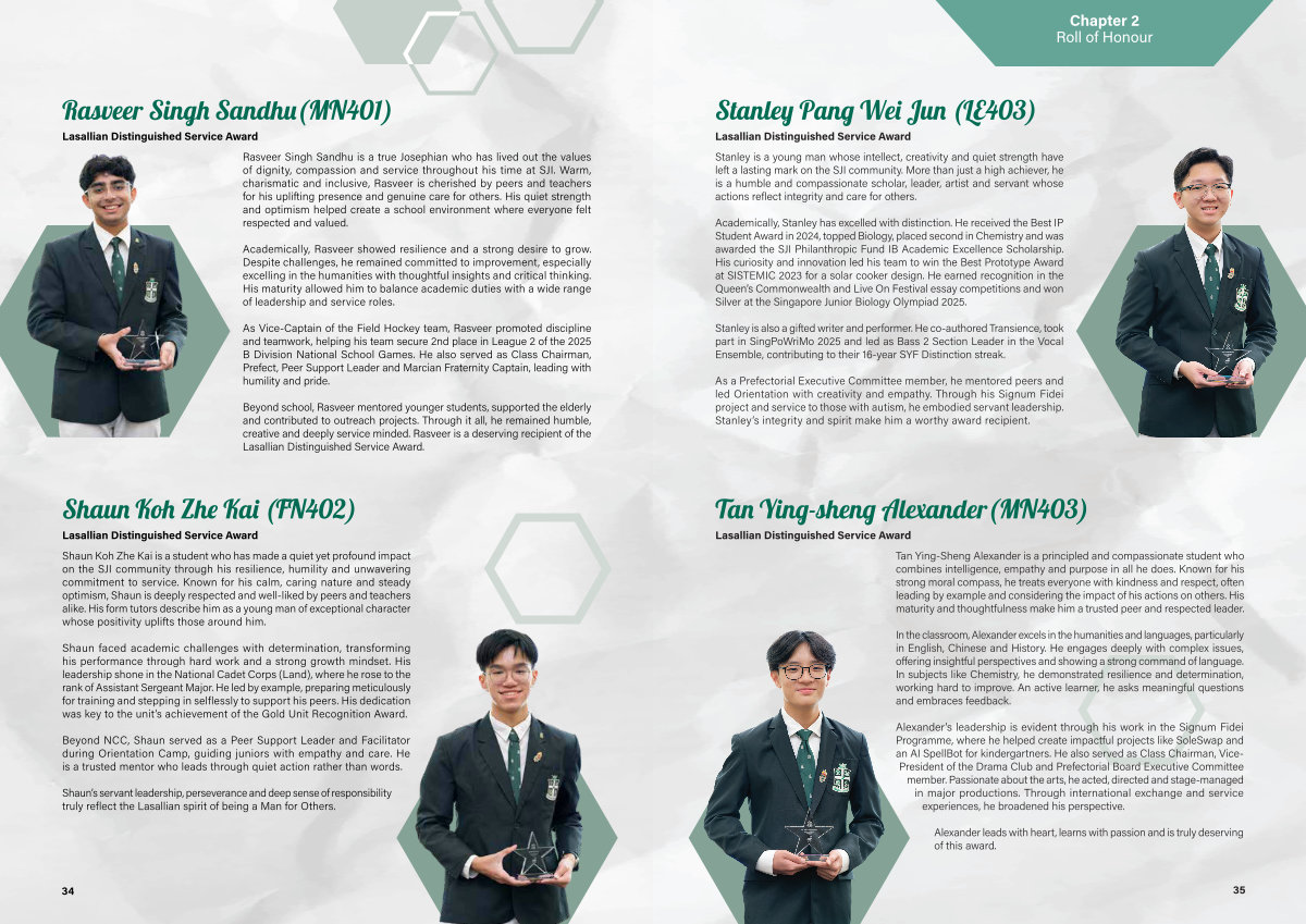 Stanley is a young man whose intellect, creativity and quiet strength have left a lasting mark on the SJI community. More than just a high achiever, he is a humble and compassionate scholar, leader, artist and servant whose actions reflect integrity and care for others.