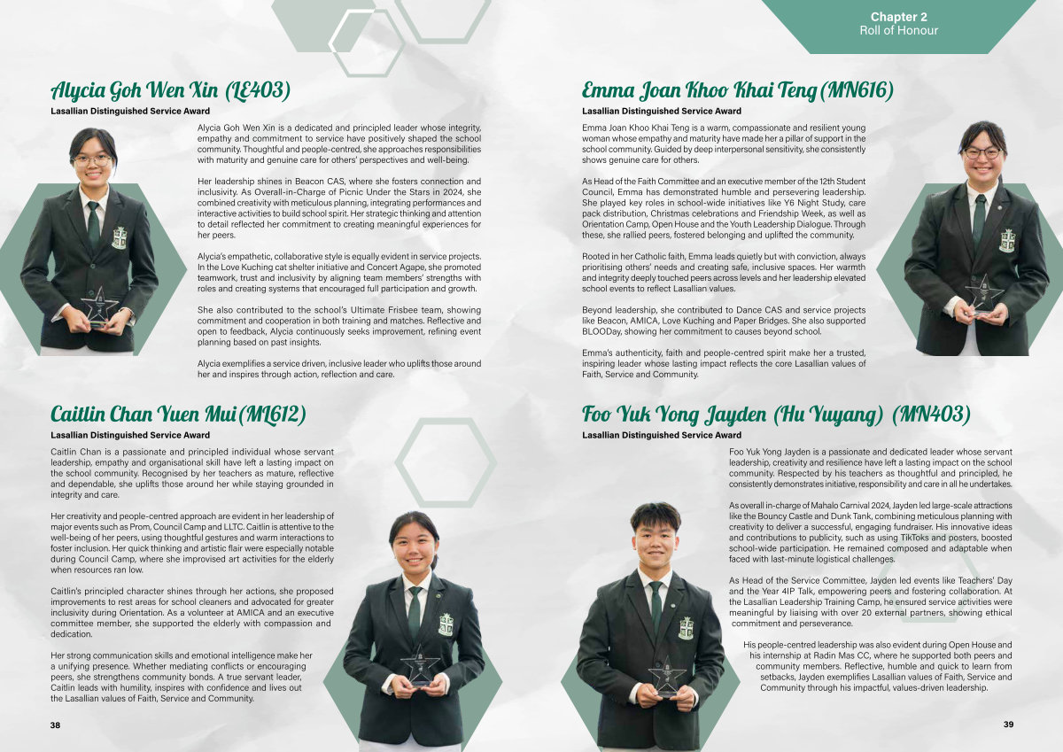 His people-centred leadership was also evident during Open House and his internship at Radin Mas CC, where he supported both peers and community members. Reflective, humble and quick to learn from setbacks, Jayden exemplifies Lasallian values of Faith, Service and Community through his impactful, values-driven leadership.