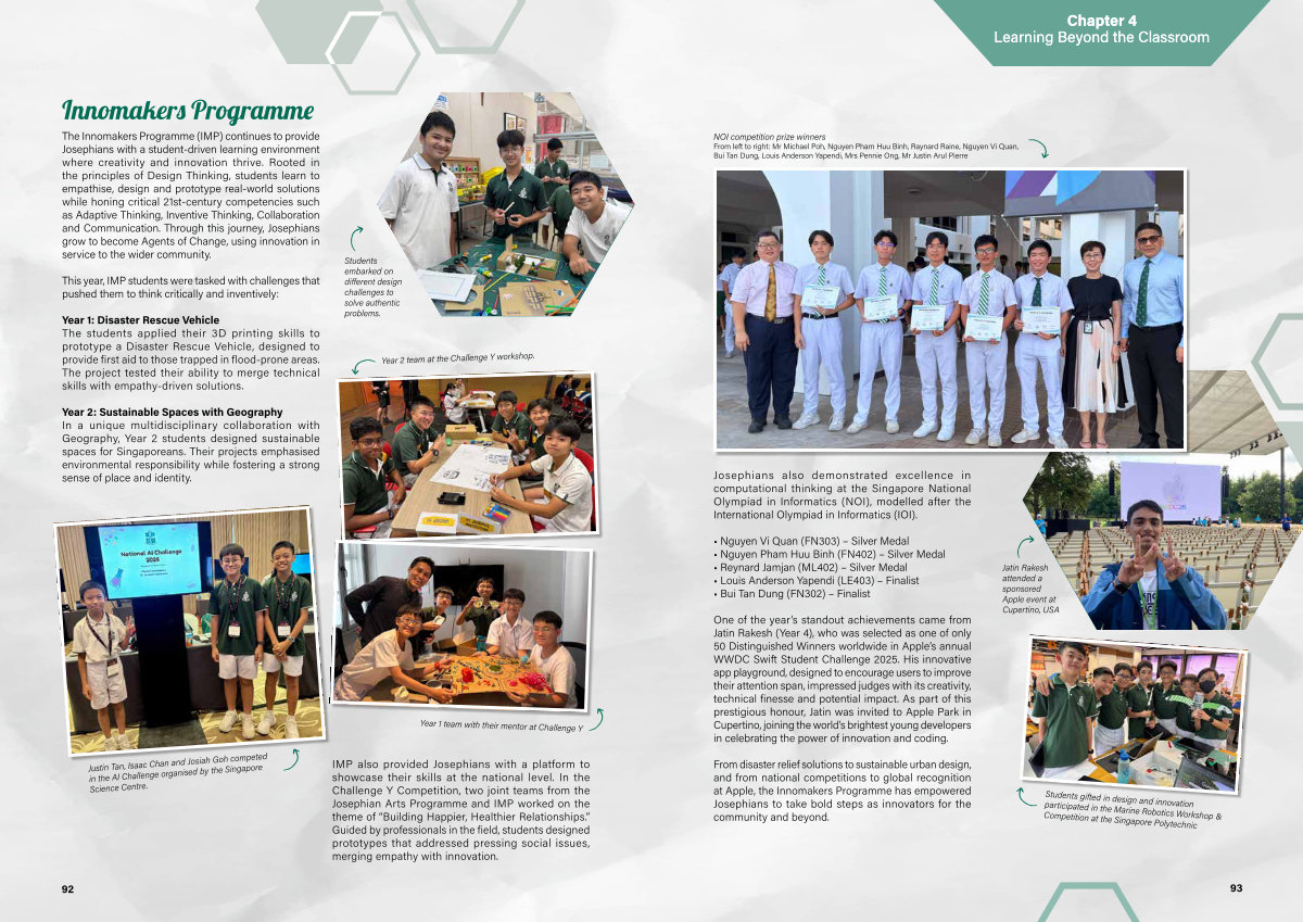 The Innomakers Programme( IMP) continues to provide Josephians with a student-driven learning environment where creativity and innovation thrive. Rooted in the principles of Design Thinking, students learn to empathise, design and prototype real-world solutions while honing critical 21st-century competencies such as Adaptive Thinking, Inventive Thinking, Collaboration and Communication. Through this journey, Josephians grow to become Agents of Change, using innovation in service to the wider community.