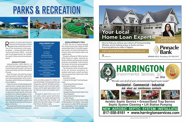 Residents of Joshua don’ t have to travel far to find recreation, fitness opportunities and family activities. Two of the community’ s most popular places— Joshua City Park and the Joshua Community YMCA— provide year-round opportunities for outdoor fun, sports, fitness and community programs.