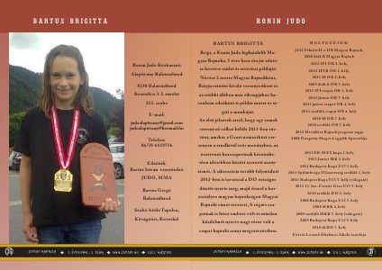 BARTUS BRIGITTA Brigi, a Ronin Judo leg atalabb Magyar Bajnoka. 5 éves kora óta jár edzésre követve szülei és testvérei példáját. N vére 2 szeres Magyar Bajnokként, Bátyja szintén kiváló versenyz ként és az utóbbi id ben már édesapjához hasonlóan edz ként is példát mutat és segíti a munkáját. Az els jelzések arról, hogy egy remek versenyz válhat bel le 2011-ben történt, amikor a Grazi nemzetközi versenyen a rendkívül er s mez nyben, az összevont korcsoportnak köszönhet en id sebben között szerzett aranyérmet. A sikerszéria tovább folyatódott 2012-ben is tavasszal a DO országos dönt t nyerte meg, majd sszel a korosztályos magyar bajnokságon Magyar Bajnoki címet szerzett, A régiós csapatnak is húzó embere volt és minden küzdelmét nyerve nagy része volt a csapat bajnoki arany megsz erzésében.