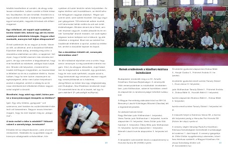 kés?bb kezdhettem el csinálni, de ahogy szép lassan er?södtem, tudtam csinálni a földet éréseket, feszítéseket, ?k sem kíméltek. Emellett én is egyre jobban éreztem a határaimat, igyekeztem egyre komolyabb, nagyobb kihívások elé állítani magamat. Egy vállalkozó, aki napjait saját szabályai, keretei között tölti, bekerül egy zárt és merev szabályok m?ködtette közegbe. Hogyan alkalmazkodik, mennyire kell fejben átkapcsolnia? Át kell szellemülni és ez nagyon jó érzés. Várom az id?t, az alkalmat, amit a dzsúdóval tölthetek. Eljutottam általa addig, ameddig még soha: a dzsúdóhoz alakítottam az id?m, a napjaimat. Volt olyan, hogy el kellett utaznom más városba dolgozni, de úgy szerveztem a tárgyalásaimat, hogy mire kezd?dik az edzésem, addigra haza tudjak érni. Minden elé helyeztem, mindennél fontosabb lett.Nagyon megijedtem, az összeomláskor,féltettem az én és a családom életét is, hiszen tudtam, hogy ha nem tudom visszanyerni az egészségemet, akkor nem tudom helyrehozni azokat a dolgokat, amiket a válság és az én rossz döntéseimmel el?idéztem.Ebben nagyon sokat segített a dzsúdó. Mondhatni, hogy adott egy stabil, biztos pontot a bizonytalanságok közepette az életében? Igen. Egy vény köteles „gyógyszer” volt számomra, amit kedden és csütörtökönként kötelez? volt beszednem. Nagyon rosszul éreztem magam, hogy ha nem kaptam meg az „adagomat”. A teste mellett a lelke is edz?dött? Változott valamit a személyisége, természete? Er?sebb lett az idegrendszerem, jobb a kontrollrendszerem. Stabilabb és nyugodtabb vagyok bizonyos válságosabb szituációkban, kön-