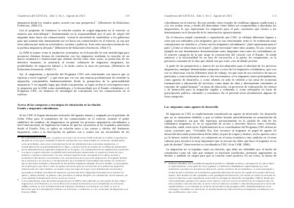 Con el propósito de fortalecer la relación estados de origen-migrantes en el exterior, se enuncia una metodología 83, fundamentada en la responsabilidad que el país de origen del migrante tiene hacia sus connacionales,“ existe la necesidad de sensibilizar a los gobiernos para que asuman más intensamente ese rol hacia sus connacionales en el exterior, ya sea que estos salieran por motivos económicos, sociales o políticos. Esto sería una nueva forma de ver la política migratoria del país.”( Ministerio de Relaciones Exteriores, 2004:17).