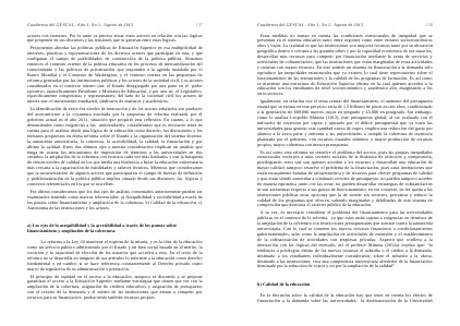 Por último consideramos que los dos ejes de análisis comentados anteriormente pueden ser examinados teniendo como marcos referenciales: a) Asequibilidad y accesibilidad a través de los puntos sobre financiamiento y ampliación de la cobertura, b) Calidad de la educación, c) Autonomía de las instituciones y los actores.