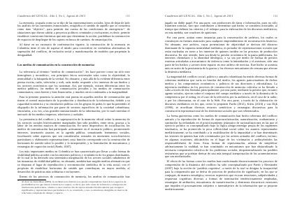 La persistencia del conflicto y la superposición de la memoria oficial sobre la memoria de los sectores sociales históricamente marginados han sido posibles, entre otros, gracias a la labor de los medios masivos de comunicación. En tanto dispositivos de socialización, los medios de comunicación han participado activamente en el escenario político, promoviendo intereses, insertando asuntos en la agenda pública, tematizando fenómenos sociales, focalizando sobre aspectos que son considerados centrales en momentos socio-históricos particulares y elaborando representaciones cuya función corresponde con la construcción de horizontes de sentido sobre lo posible y lo interpretable, y la formulación de mecanismos y estrategias de cognición social( Pardo, 2007).