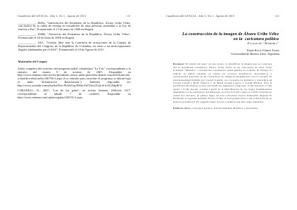 Resumen: El interés del autor en este ensayo es identificar la imagen que se construye del ex presidente colombiano Álvaro Uribe Vélez en las caricaturas de Julio César González“ Matador”, caricaturista colombiano, quien publica en el diario El Tiempo. El análisis se realiza teniendo en cuenta los recursos metafóricos, metonímicos y transtextuales presentes en las caricaturas. Se trabaja principalmente con el concepto de transtextualidad definido por Gerard Genette, los conceptos de metáfora y metonimia de George Lakoff y Mark Johnson y de María Joseph Cuenca y Joseph Hilferty. Para la realización del análisis se han construido las siguientes categorías: Uribe inocente, Uribe astuto y Uribe mesías, creadas a partir de la identificación de los rasgos fundamentales imprimidos en las caricaturas del dibujante. La selección del corpus se realizó teniendo en cuenta dos factores: en primer lugar, las tres caricaturas fueron elaboradas después de finalizado el segundo mandato Álvaro Uribe, lo cual permite hacer una evaluación de su gestión presidencial. En segundo lugar, las tres contienen una alta carga semántica.