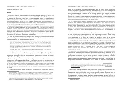 .. como si el narrador fuese un coleccionista que vuelve sobre lo hallado en la acción de traer al recuerdo desde la praxis, como la más terminante entre las distintas manifestaciones profanas de la cercanía( 2005), el narrador muestra elementos que provocan una lectura, volviendo a ellos en búsqueda de la marcación que esconden.